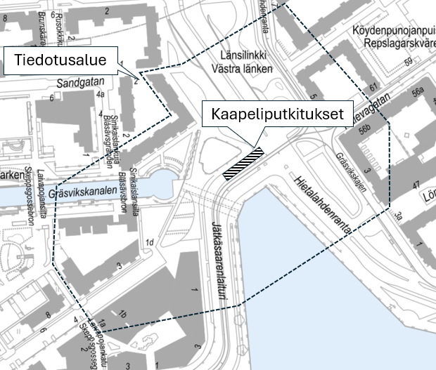 Ilmoitus koskee kaapeliputkien alituksia ajokaistoilla Jätkäsaarenlaiturin ja Jätkäsaaren kannaksen sillan katu-urakassa 2.10. - 3.10.2025, 8.10. - 9.10.2025 ja 9.10 - 10.10 kello 21.00 - 6.00 (Kuva 1).