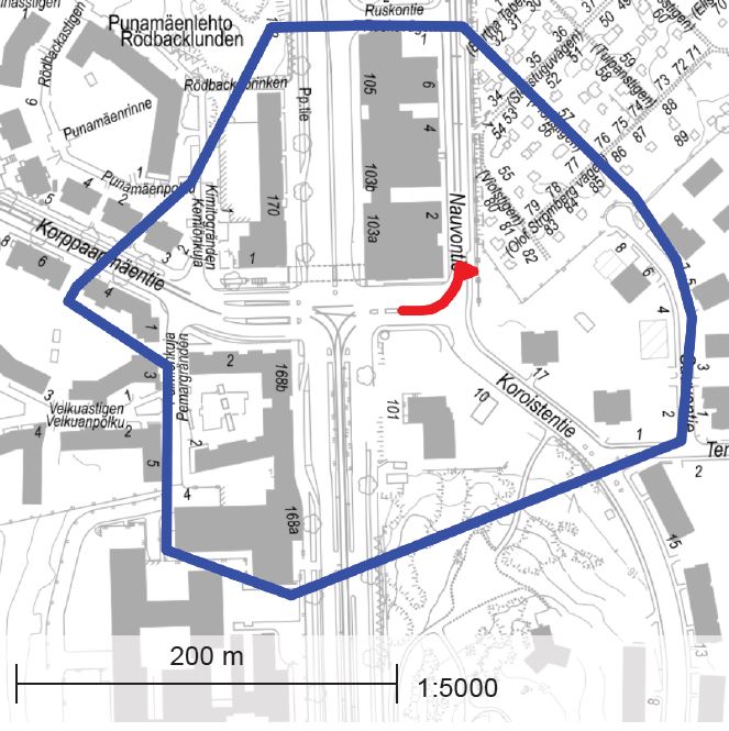 - Työtä koskeva tiedote on jaettava alla olevaan karttaan (Kuva 1) merkityn tiedotusalueen jokaiseen rakennukseen. Tiedote on jaettava vähintään kaikkiin porraskäytäviin, mutta mieluiten jokaiseen asuin- ja liikehuoneistoon. Lisäksi tiedote on toimitettava alueen asukasyhdistykselle, Ruskeasuo-Seura ry:lle.