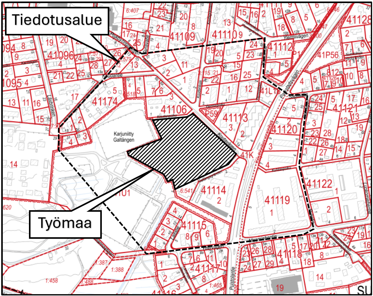 Kuva 1. Työmaan sijainti ja tiedotusalue (määräys 3).