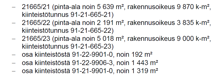 Lisäalueet (osa kiinteistöstä 91-22-9901-0, noin 192 m², osa kiinteistöstä 91-22-9906-3, noin 1 443 m² ja osa kiinteistöstä 91-21-9901-0, noin 1 319 m²) varataan yhteisesti osapuolien kesken tarkastelualueeksi.