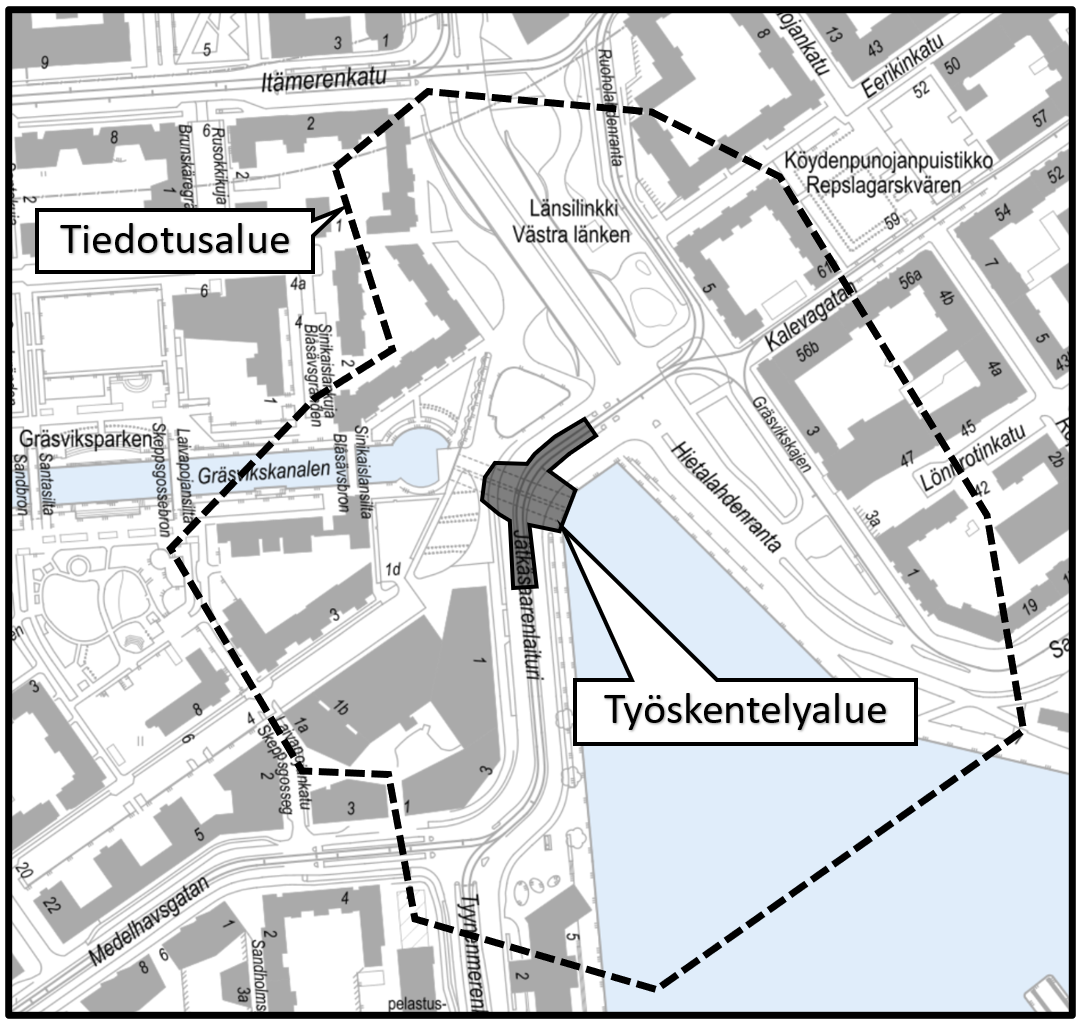 Ilmoitus koskee raitioliikennekatkon aikana 7.4. - 10.5.2026 maanantaista sunnuntaihin kello 0.00 - 24.00 tehtäviä purku- ja rakennustöitä Jätkäsaaren kannaksen siltatyömaalla (kuva 1). Kyseessä on aikaisemmin tehdyn ilmoituksen muuttaminen raitioliikennekatkon ajaksi.