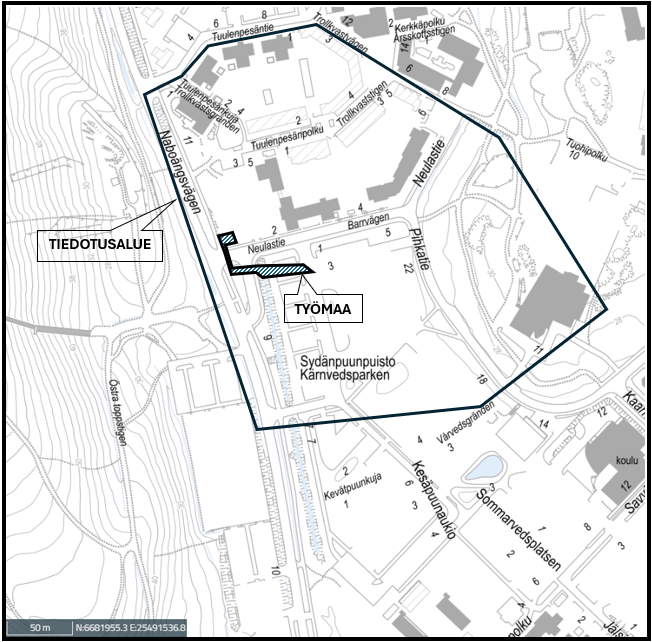 Töitä ei saa tehdä pyhäpäivinä eikä niihin rinnastettavina muina yleisinä juhlapäivinä. - Työtä koskeva tiedote on jaettava alla olevaan karttaan (Kuva 1) merkityn tiedotusalueen jokaiseen rakennukseen. Tiedote on jaettava vähintään kaikkiin porraskäytäviin, mutta mieluiten jokaiseen asuin- ja liikehuoneistoon.