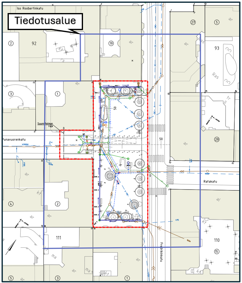 - Työtä koskeva tiedote on jaettava hyvissä ajoin ennen työn aloittamista alla olevaan karttaan (kuva 1) merkityn tiedotusalueen jokaiseen rakennukseen. Asuinrakennuksissa tiedote on jaettava vähintään jokaiseen porraskäytävään, mutta mieluiten jokaiseen asuinhuoneistoon.