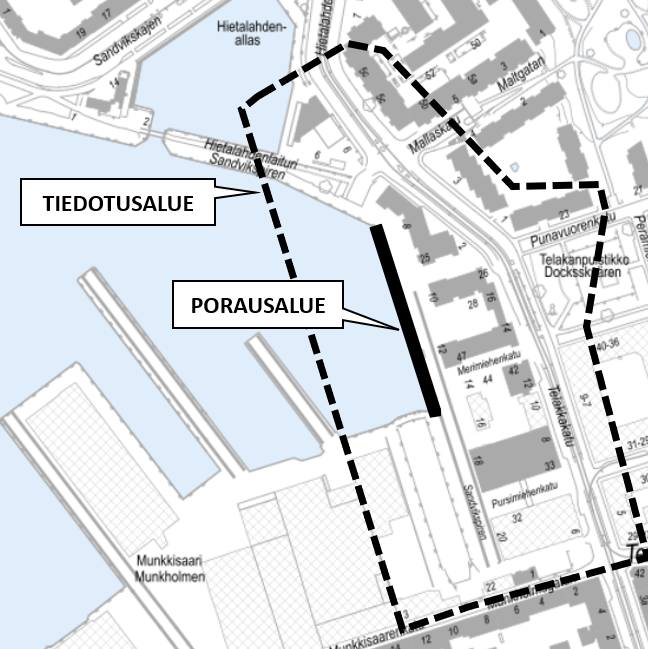 Ilmoitus koskee rantarakentamiseen liittyvää porapaalutusta ja ankkuriporausta 17.11.2025−30.4.2026 arkisin maanantaista perjantaihin kello 7.00−18.00 osoitteessa Hietalahdenlaituri. Ilmoitetussa toiminta-ajassa on kaksi kuukautta varoaikaa mahdollisten viivästymisten vuoksi. Työmaan sijainti on esitetty kuvassa 1.